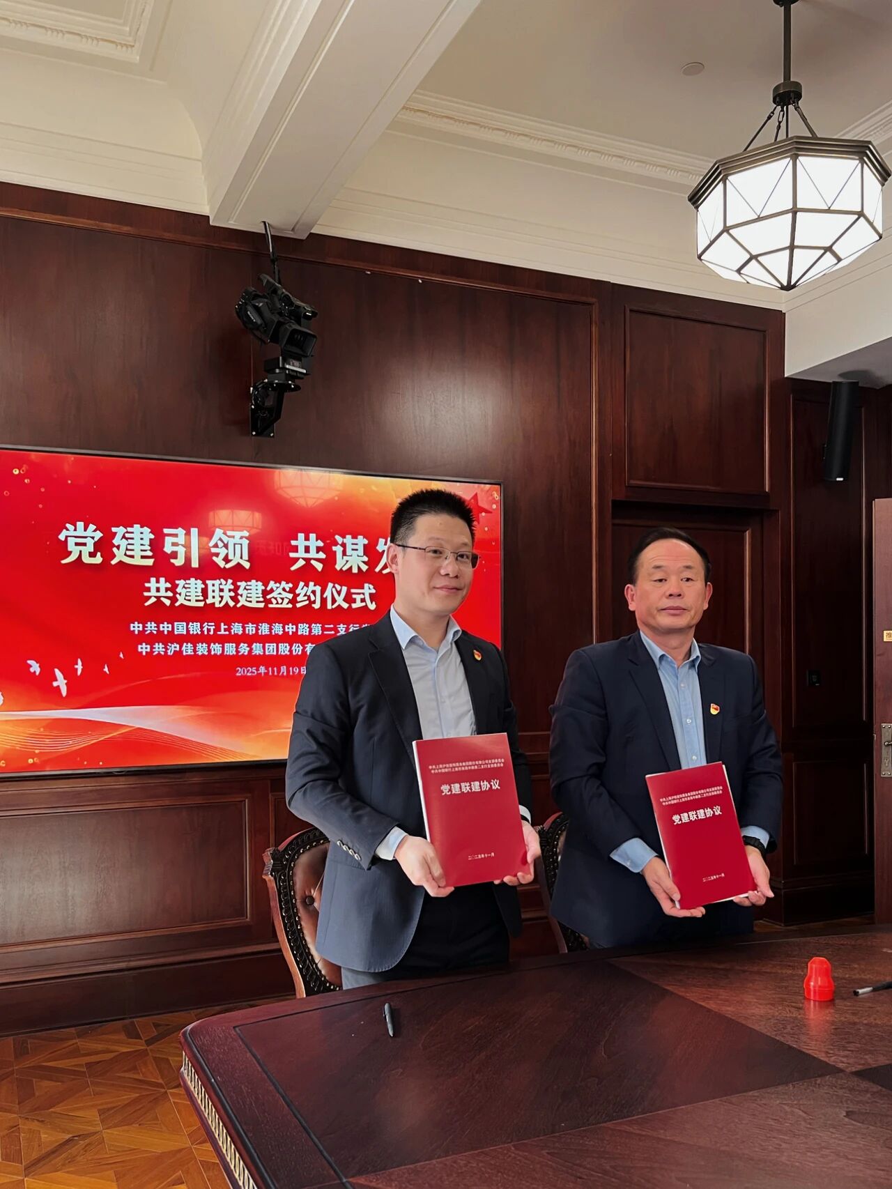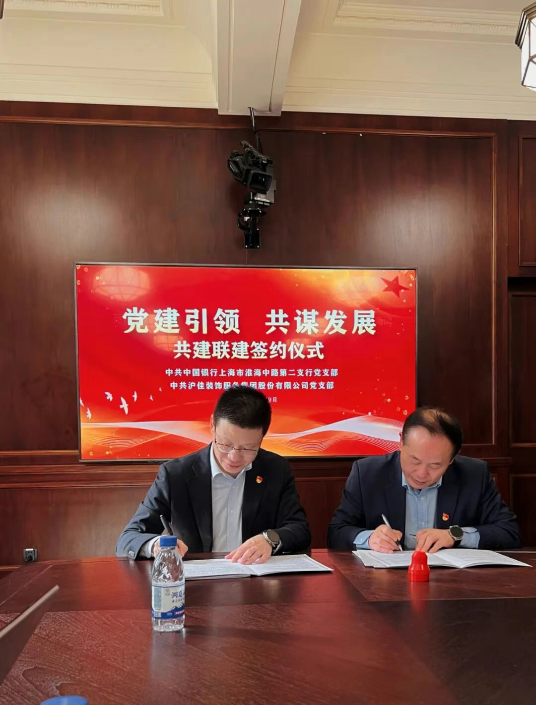 此次党建联建签约仪式为沪佳装饰与中国银⾏上海淮海中路第⼆⽀⾏搭建了⼀个良好的沟通交流平台。双⽅将以此次共建为契机,凝聚共识,通过共学深化共进,在服务客户、社会公益等领域进⼀步促成合作。