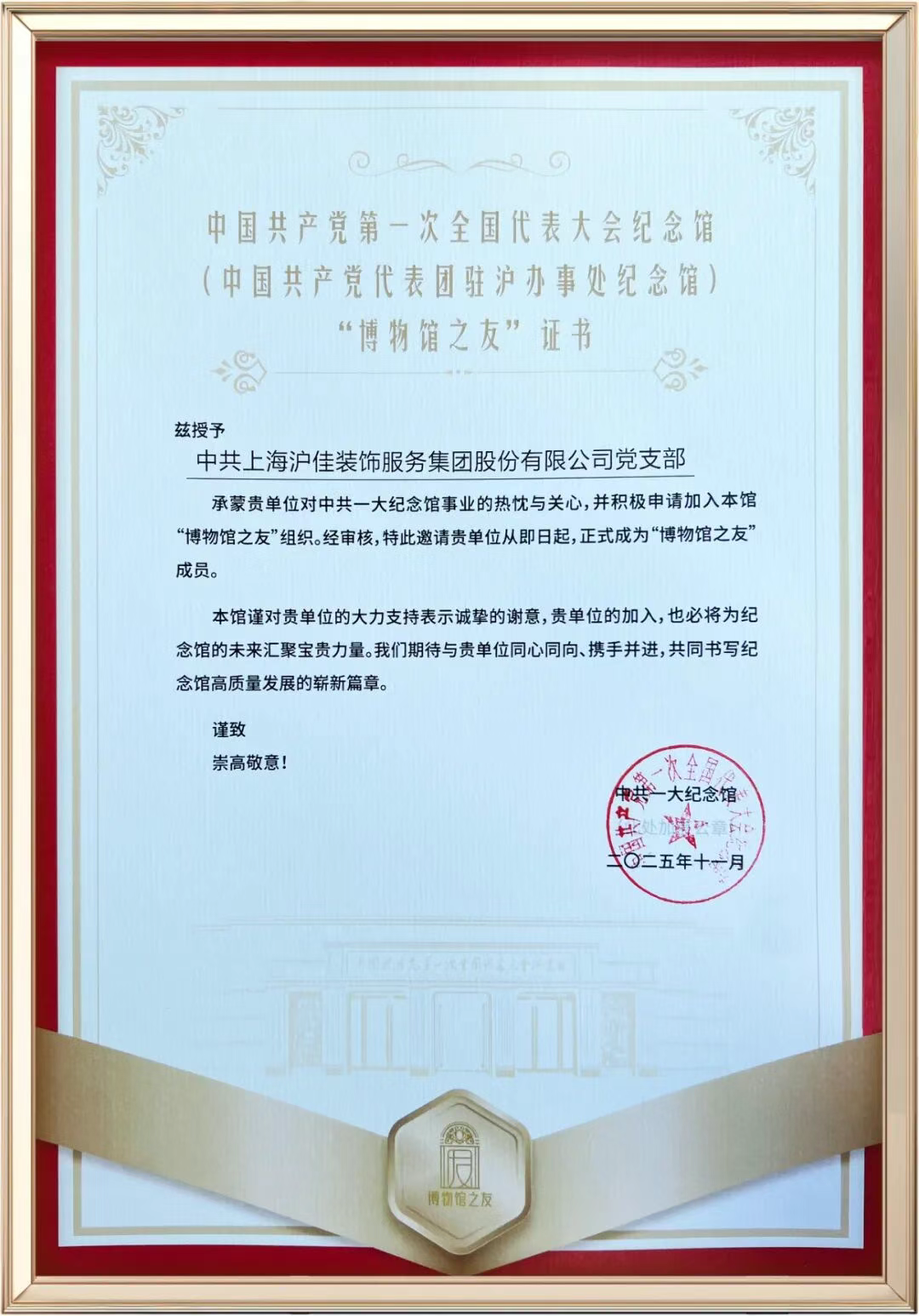2025年11月17日,上海沪佳装饰集团党支部正式加入中共一大纪念馆“博物馆之友·团队会员”,解锁全新身份,踏上意义非凡的文化传承与创新之旅。
