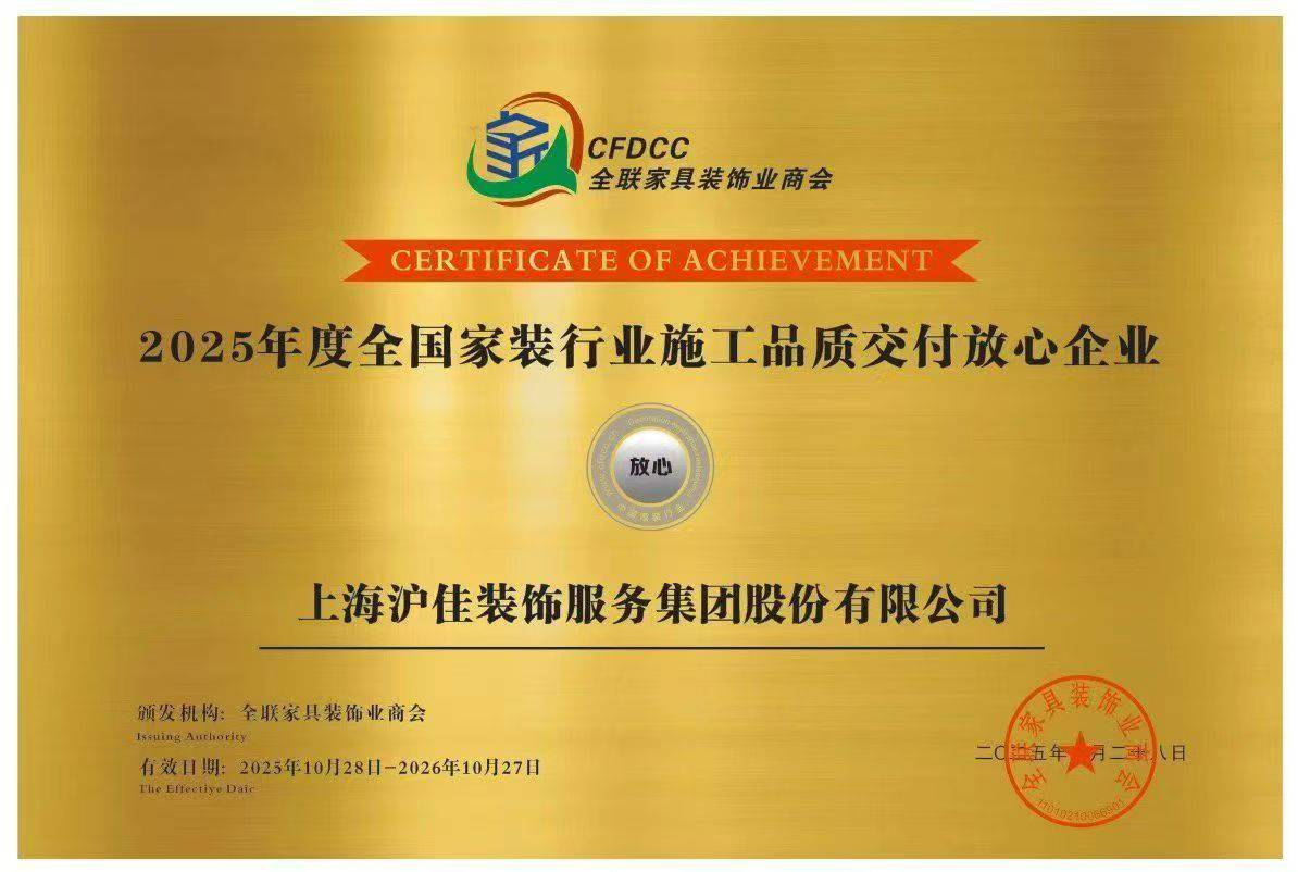 沪佳装饰荣获2023年上海住宅装饰装修企业服务能力五星级评价