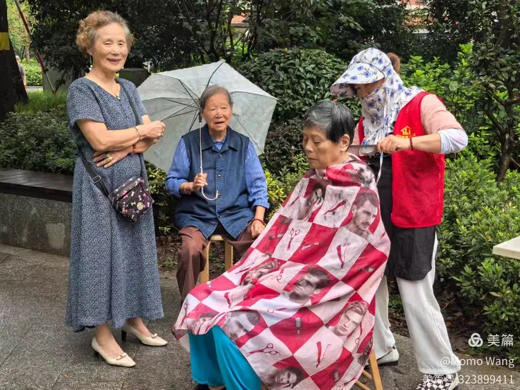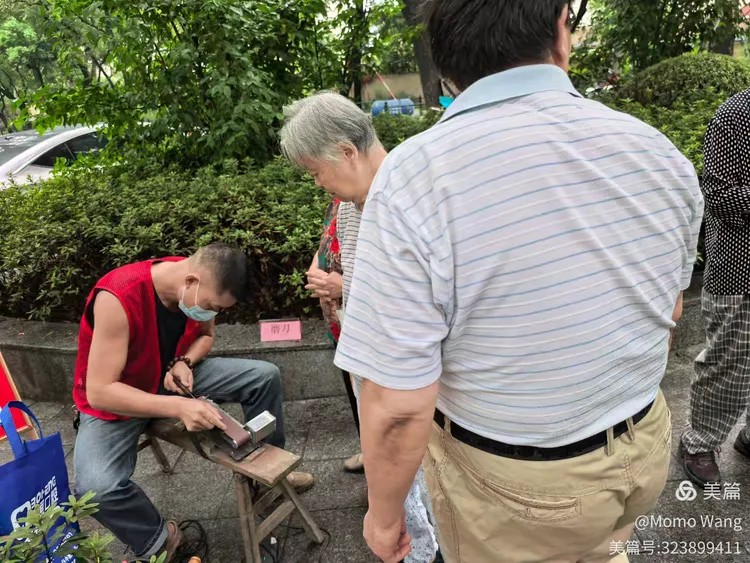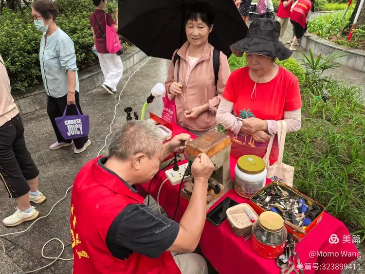活动开始没多久,天空突然飘起了蒙蒙细雨。细雨如丝,轻轻地洒在人们的伞上,发出沙沙的声响。但这丝毫没有打消居民们的热情。他们迅速拿出雨具,依旧有序地排着队,脸上没有一丝不快,反而多了几分坚韧和乐观。老人们拿着号码牌,排队等待理发,他们互相打趣,笑声在雨中回荡。有些居民则在磨刀区排队,一边等待一边唠唠家常,分享着生活中的点点滴滴。测量血压和血糖的队伍也排得长长的,居民们互相鼓励,互相安慰,现场充满了温暖和关怀。